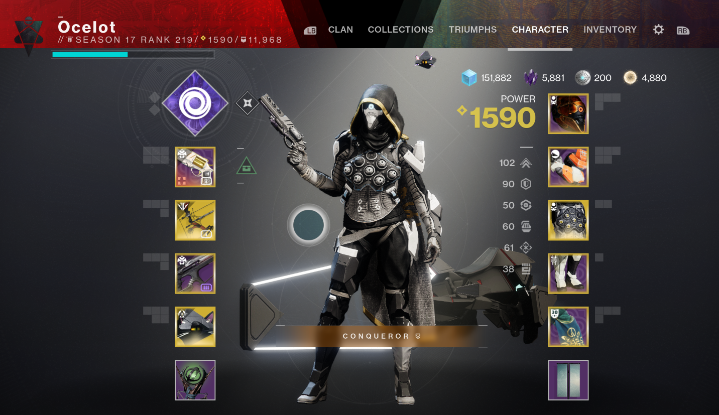 Image: This is my Destiny Character. On the left are my current weapons. On the far right are my current armor pieces. The series of numbers next to my armor are my skill points.